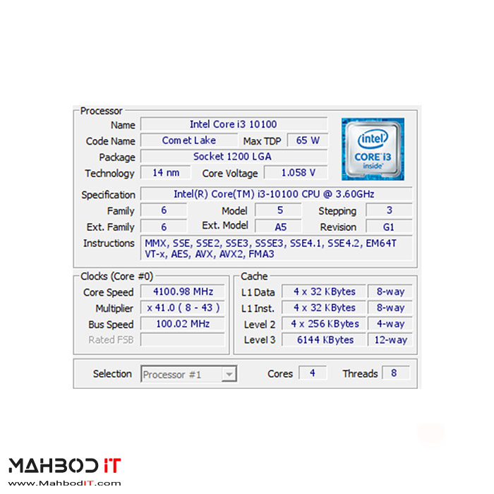 مشخصات کلی سری پردازنده : Core i3 تعداد هسته : 4 هسته - 8 رشته Base فرکانس : 3.6 گیگاهرتز سوکت : Intel 1200 پردازنده گرافیکی : UHD Graphics 630 توان مصرفی : 65 وات هیتسینک و فن پردازنده : ندارد
